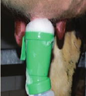 • Nettoyer toute la surface du trayon en insistant plus particulièrement sur l’extrémité. (15-20 secondes sont nécessaires pour assurer un bon nettoyage et favoriser la sécrétion de l’ocytocine donc l’éjection de lait).