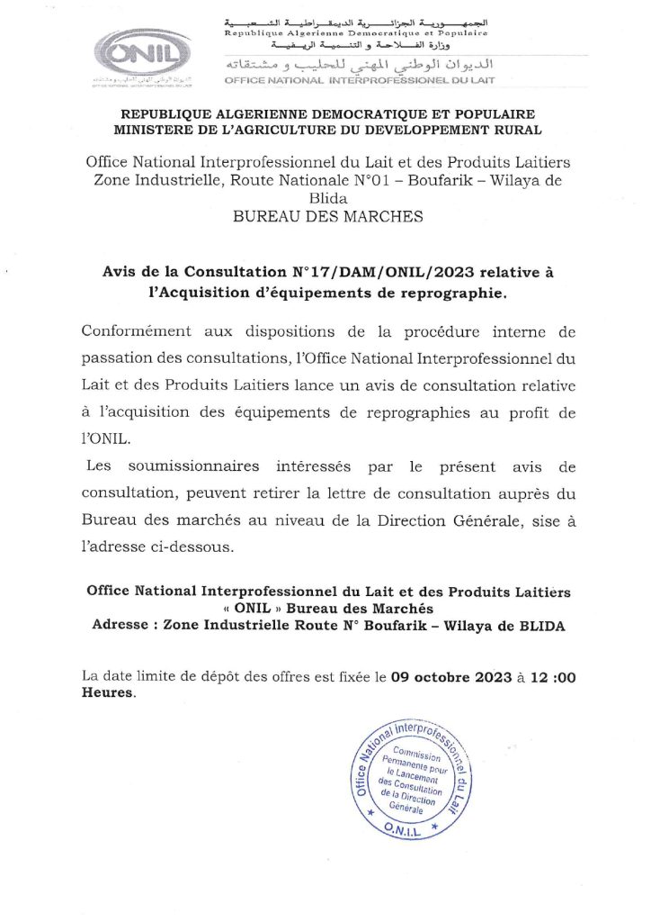 Conformément aux dispositions de la procédure interne de passation des consultations, l’Office National Interprofessionnel du Lait et des Produits Laitiers lance un avis de consultation relative à l’acquisition des équipements de reprographies : profit de l’ONIL. Les soumissionnaires intéressés par le présent avis de consultation, peuvent retirer la lettre de consultation auprès du Bureau des marchés au niveau de la Direction Générale, sise à l’adresse ci-dessous. Office National Interprofessionnel du Lait et des Produits Laitiers « ONIL » Bureau des Marchés Adresse : Zone Industrielle Route N° Boufarik – Wilaya de BLIDA La date limite de dépôt des offres est fixée le 09 octobre 2023 à 12:00 Heures.
