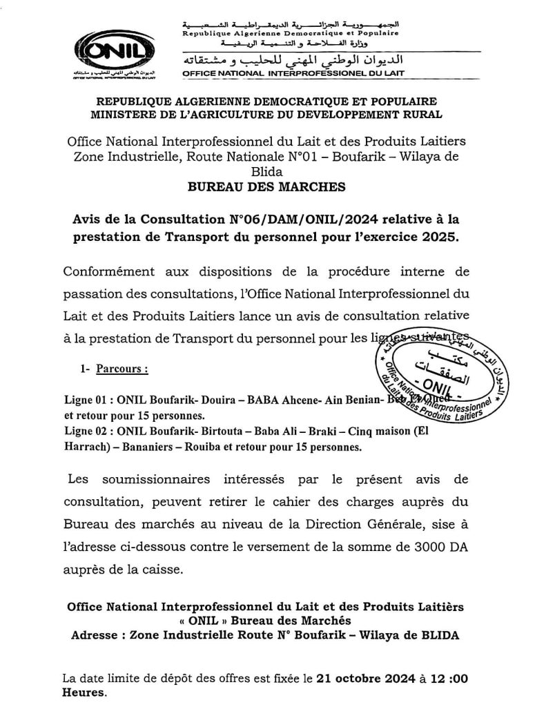AVIS DE CONSULTATION N°6/DAM/ONIL/2024
