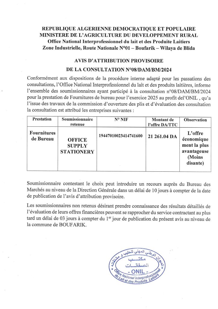 AVIS D’ATTRIBUTION PROVISOIRE DE LA CONSUILTATION N°08/DAM/BM/2024