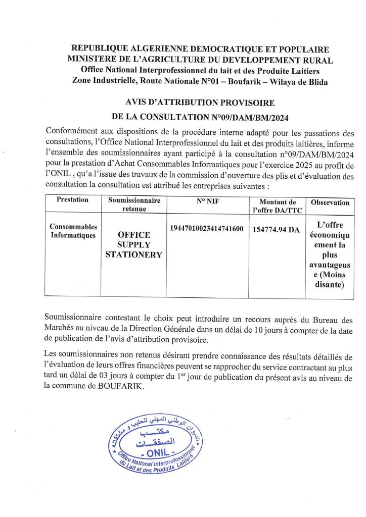AVIS D’ATTRIBUTION PROVISOIRE DE LA CONSULTATION N°09/DAM/BM/2024