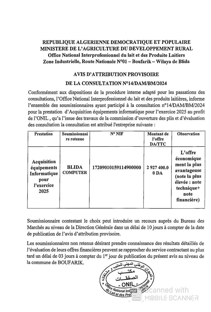 Avis D’ATTRIBUTION PROVISOIRE DE LA CONSULTATION N032/DRO/ONIL/2024 ORAN